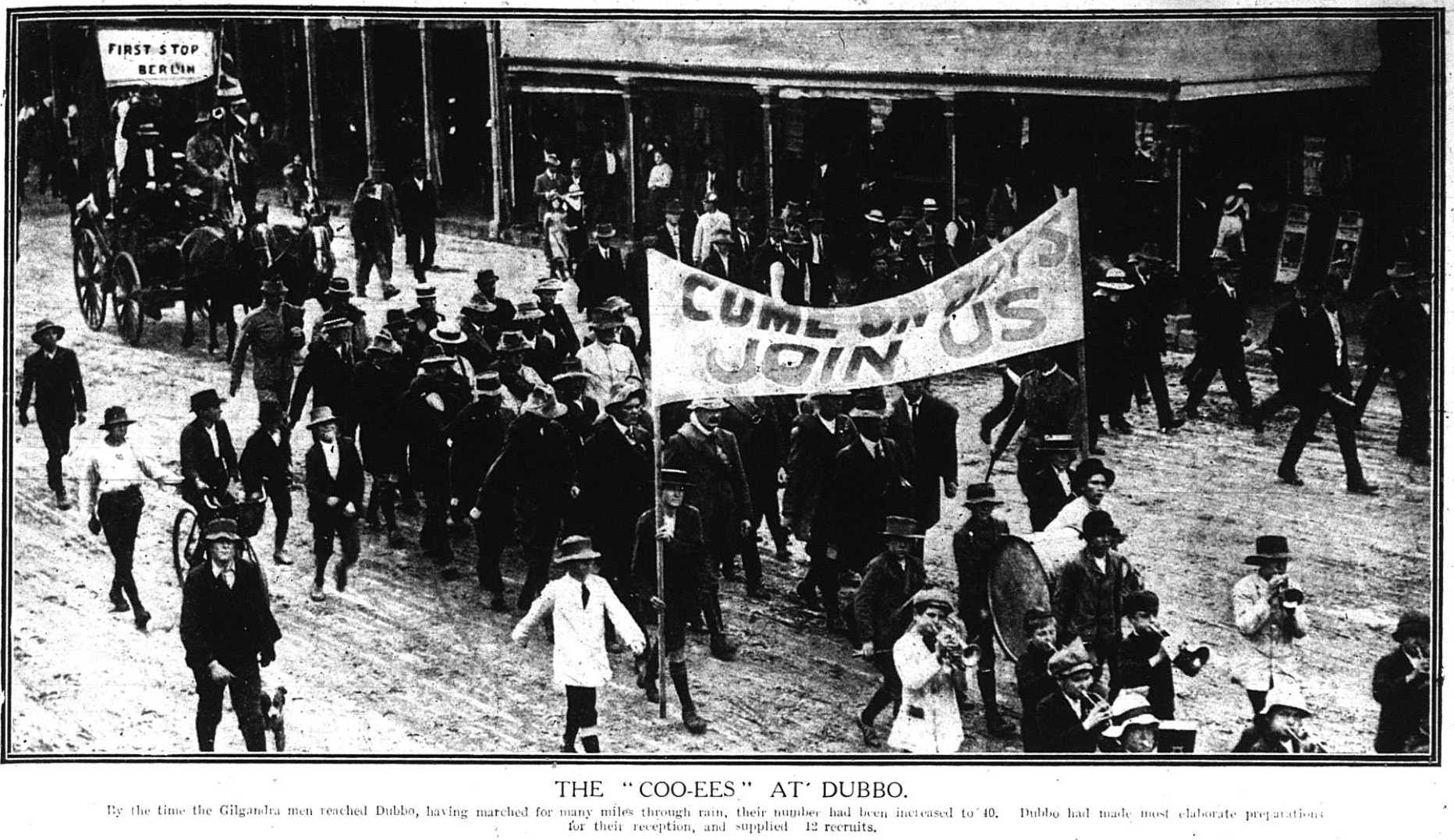 Mr. A. Carson, the school teacher, had arranged with the ladles of Brocklehurst to prepare lunch, and they did this cheerfully and well despite the rain. The ‘Coo-ees’ did justice to this part of the programme, and were then treated to a round of patriotic kissing by a bevy of Brocklehurst girls. The schoolchildren led the march on to the Dubbo road, and the girls escorted the recruits for a mile on their way despite the rain.