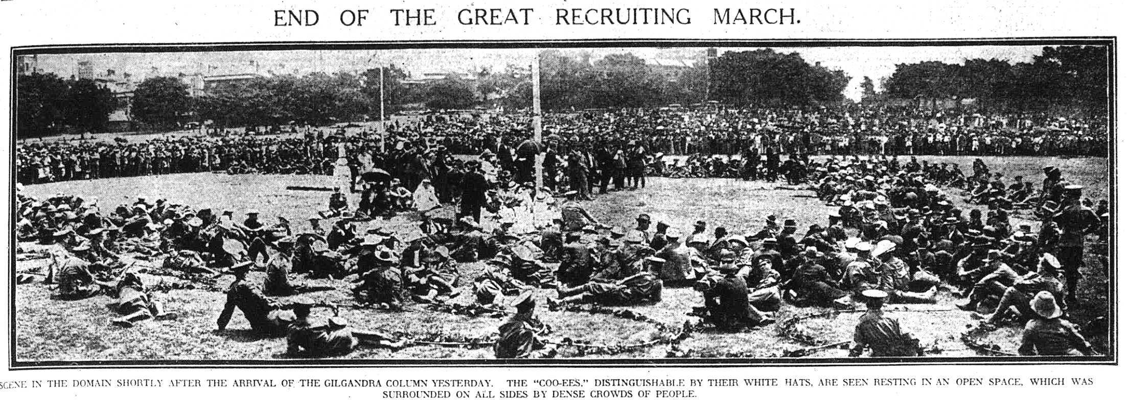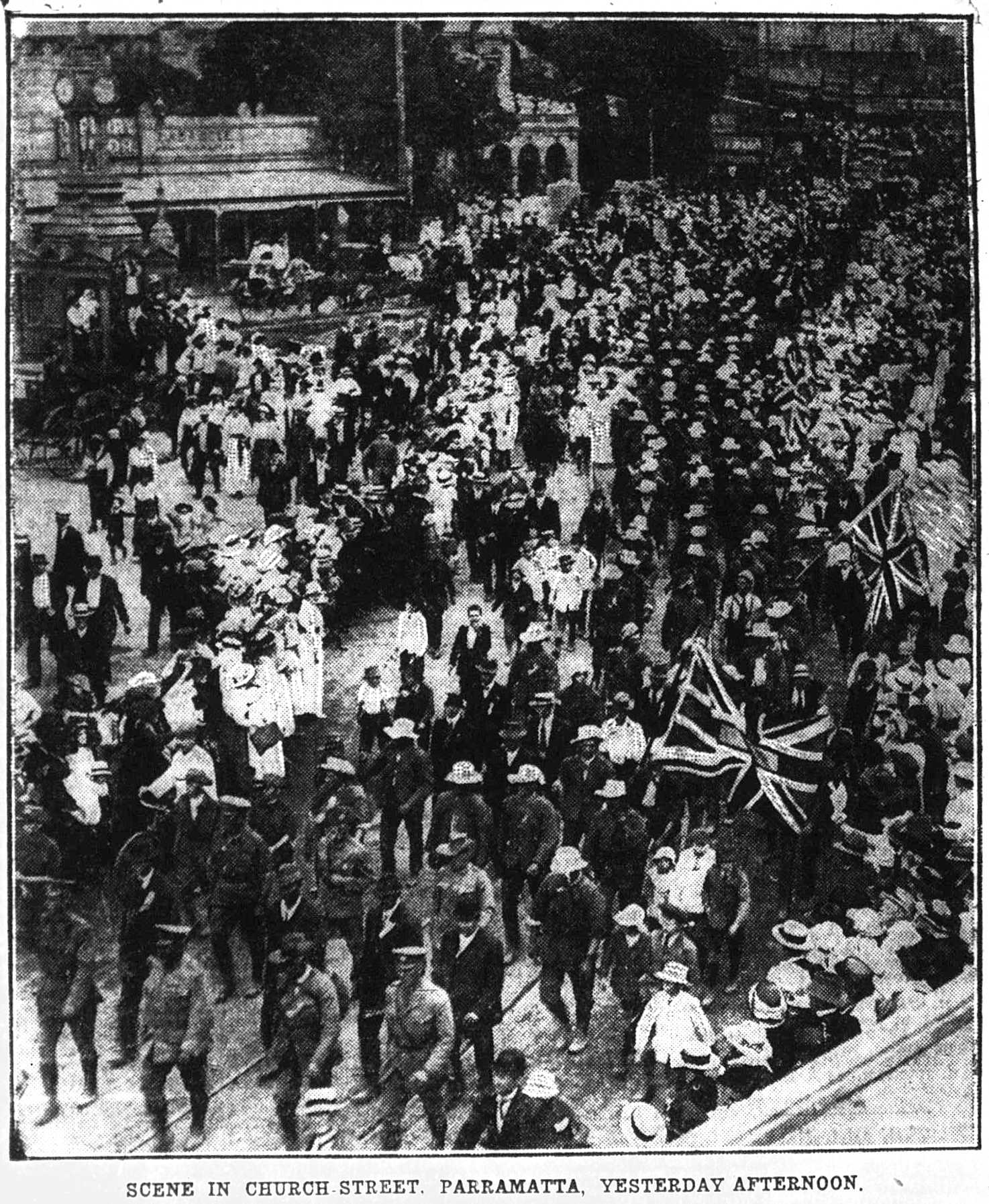 The heavy rain of the morning made it appear as if the inspection of reinforcements arranged for yesterday afternoon would not take place, and that the men would be merely marched from the Central Railway Station to the Royal Agricultural Show Ground, and for this contingency all arrangements had been made by Headquarters’ Staff. By midday, however, the sun came out; the black clouds disappeared, and when the men arrived from Liverpool the sky was brilliantly blue, flecked here and there only by masses of white cloud. To music supplied by the Liverpool Depot Band and the Casula Band, the reinforcements marched from the railway station, via Eddy-avenue, Elizabeth-street, Wentworth-avenue, and College-street to the outer Domain, entering by the St. Mary’s gates.