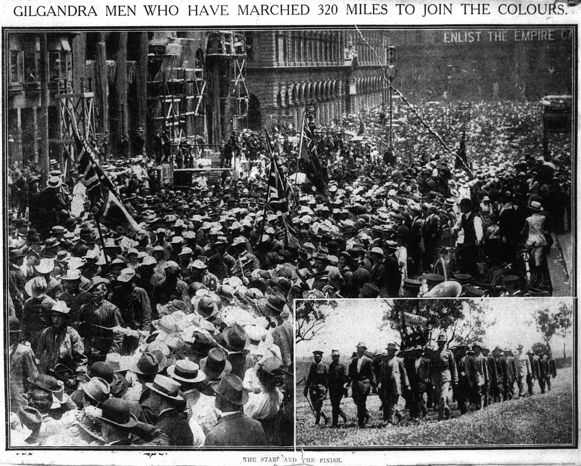Photograph and caption with heading ‘The State Commandant inspecting the Gilgandra “Coo-ees” in Sydney’ in The Sydney Mail, 15 March 1916, p. 8.