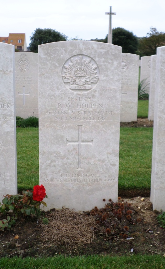 Private Holpen was buried at the Les Baraques Military Cemetery at Calais, France. Percy Walter Holpen has the rank of Lance Corporal inscribed on his headstone.