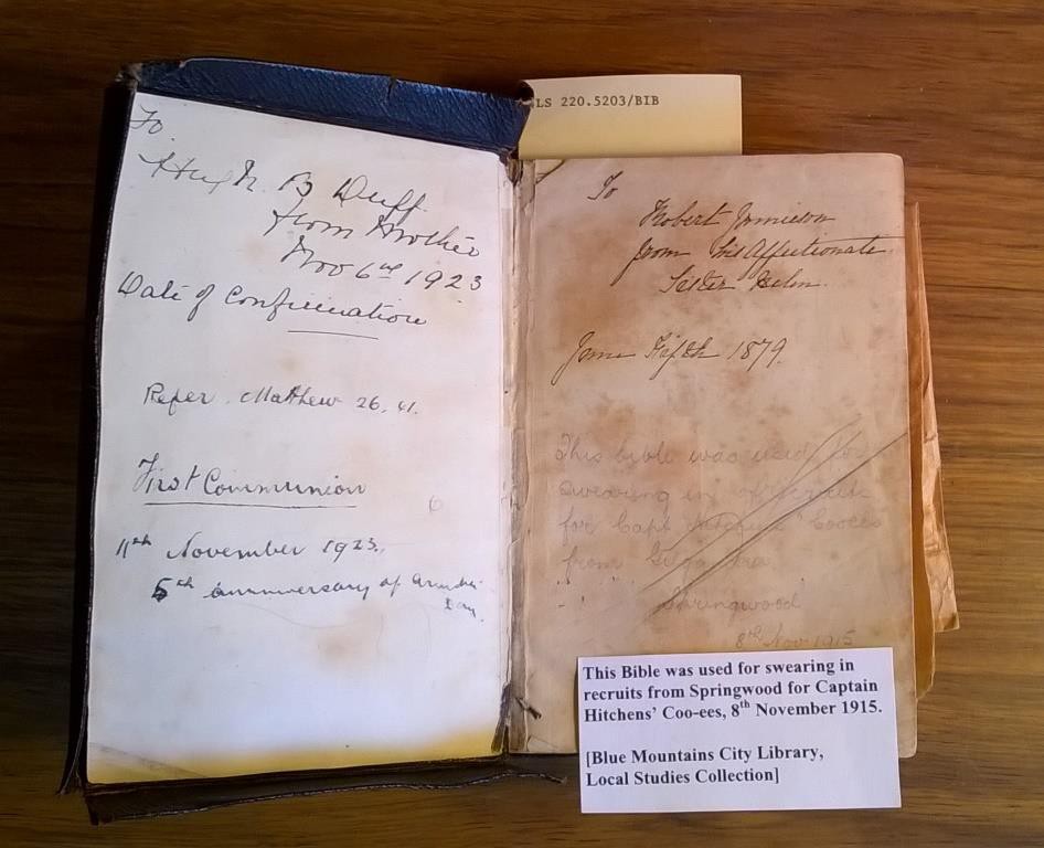 On 16th September 2015 I visited Springwood Library to meet with the Local Studies Librarian John Merriman, to view the bible on which the five Springwood Cooees recruits were sworn in, which is part of the Blue Mountains City Library Local Studies Collection.
