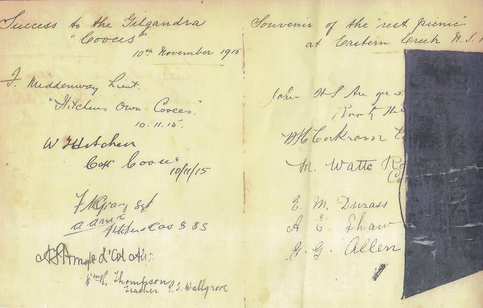 Family autograph book belonging to Mrs I. Silva, showing Bill Hitchen’s and officers’ signatures collected at Eastern Creek on 10/11/1915, and a purple Coo-ee ribbon. (Photograph courtesy of Graeme Hosken)