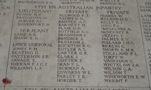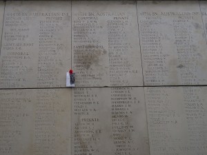 P. J. O’Loughen’s name on 3rd Battalion Australian Infantry panel [third row in centre on right] at the Menin Gate Memorial, Belgium (Photograph: S. & H. Thompson 11/9/2012)