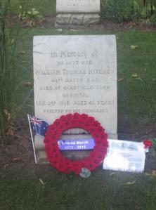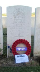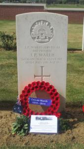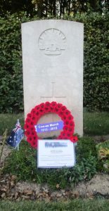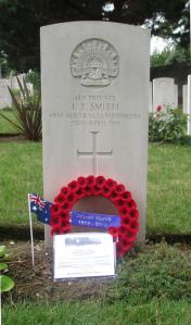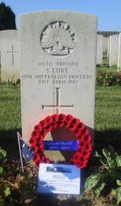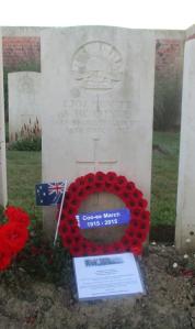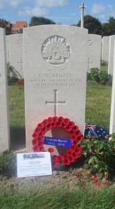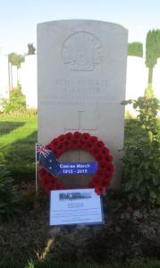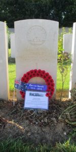 Stephen and I visited the graves of the fallen Coo-ees in France, Belgium and England in 2012, 2014, and 2016. During our 2016 visit we took a travelling wreath to rest on each of their graves. The Coo-ee March 2015 Inc. (Gilgandra Sub-Committee) provided the purple Coo-ee “badge” ribbon that we placed on our wreath, which had been created to be worn by the marchers during the 2015 Coo-ee March Re-enactment in memory of the purple “badges” worn by the original Coo-ees during the 1915 Coo-ee March. We left an Australian flag and a commemorative information card on each of their graves.